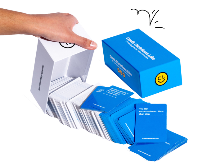 Cards Christians Like is a party game but with convictions. Each round, one player will read a prompt (blue card) for other players to fill in with their funniest response (white card). Our cards are unique observations about church and culture that play in hundreds of hilarious combinations.